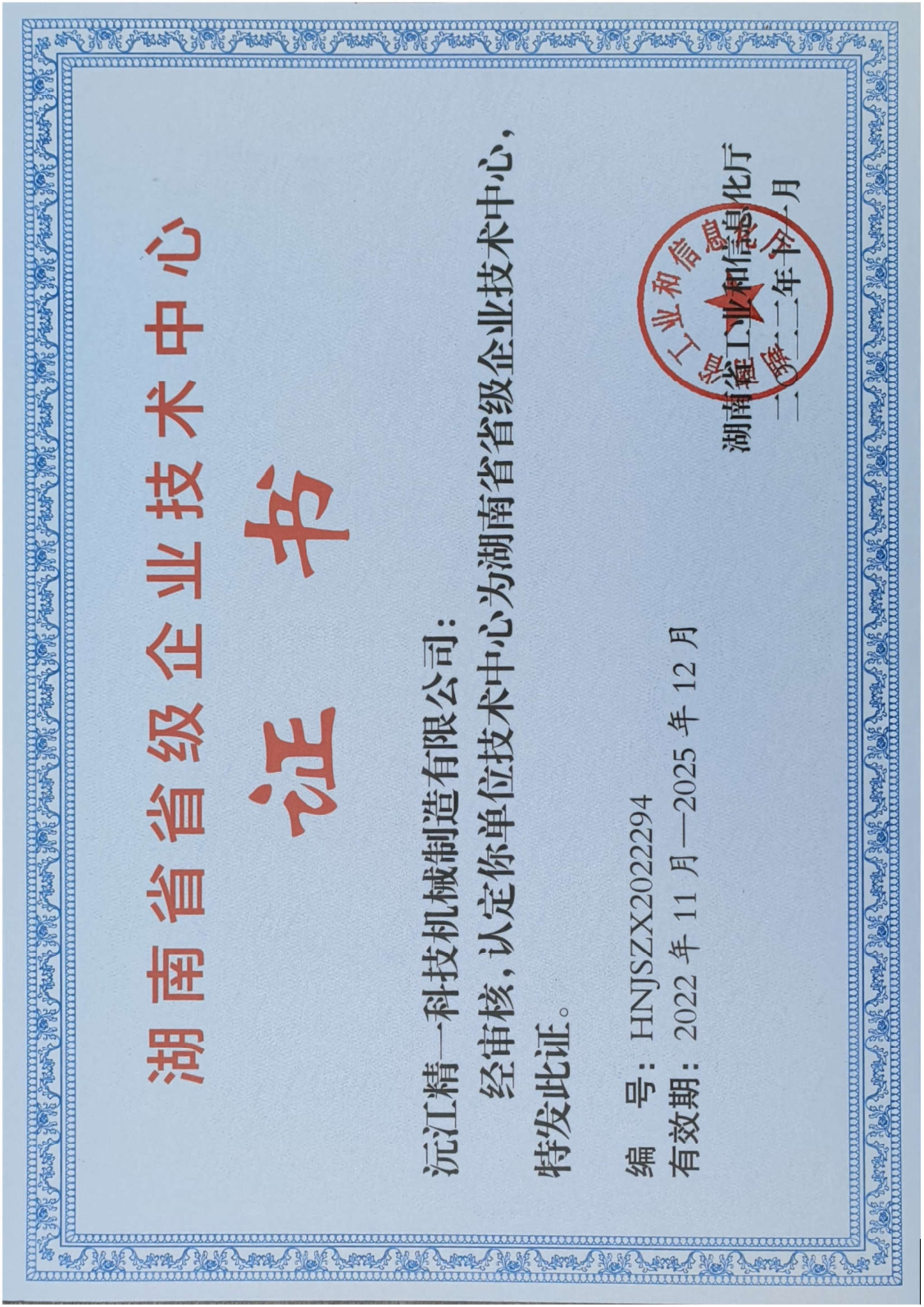 祝贺沅江精一科技机械制造有限公司获得湖南省企业技术中心